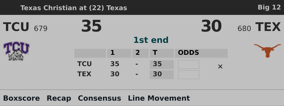 TCU vs Texas Odds & Live Scores - February 23, 2022 | The ... See betting odds, player props, and live scores for the TCU Horned Frogs vs Texas Longhorns College Basketball game on February 23, 2022